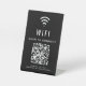 Modern and simple black table top pedestal sign to allow your customers, clients or guests to easily connect to your wifi network. Upload your wifi's QR code and add any other details, such as the network's name and password in white typography. Perfect for offices, hotels, vacation rental properties, etc.