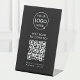 This black pedestal tabletop sign provides a clean and modern way for customers or guests to access your wifi network instantly. The design features a central QR code area that can be linked to your wifi details so users can scan to connect without typing a password. Above you can upload your business logo and below enter your network name and any custom instructions that fit your need. The minimalist layout keeps everything readable which works well for cafes, salons, studios, offices, rental properties, pop ups or event venues. Because the template is fully editable, it adapts easily to branding updates or new wifi information. A practical and polished solution that helps streamline customer access and elevates your in person experience.