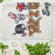 The landmarks and icons of Wigan, in Greater Manchester, England, featuring a stylized cartoon character versions of its exports and townscape, including (from left to right) a Northern Soul record, a Transport for Greater Manchester (TfGM) sign for Wigan Wallgate railway station (with Wigan Athletic scarf), an Uncle Joe's Mint Ball, the Orwell pub at Wigan Pier listening to Wigan's Pier music, and, finally, a Stagecoach bus number 32 with Wigan Warriors scarf and famous Wigan Pie. Wigan is spelled out in traditional red brick and sandstone, with cotton flower embellishment.
