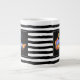 A coffee mug with a black striped pattern in the background. Layered over top is a black rectangle with a cream coloured border. Inside is a digital watercolor image of a herd of wild animals running together. Animals include a jumping dolphin, a giraffe, elephant, kangaroo, rhino, lion and leopard. Personalize with a name.