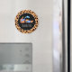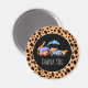 A thank you magnet designed with an exotic orange coloured leopard print pattern for a background. Layered over top is a black circular frame with a white border.