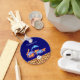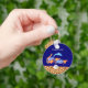 A personalized keychain designed with an exotic orange coloured leopard print border along the bottom. Illustrated with a digital watercolor image of a herd of wild animals running together. Animals include a jumping dolphin, a giraffe, elephant, kangaroo, rhino, lion and leopard. The background is a bluish purple colour. Personalize with your monogram initial inside a white circle and also place your name along the top.