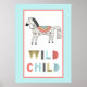 Adorable Scandinavian style folk art in both the sweet horse graphic and the letters that spell out "wild child". Illustration on white background with pastel blue border