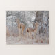 This pretty nature puzzle features my original photograph of wild White-tailed deer in Texas. The winter snow was falling as they were standing by winter trees.