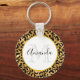 A monogram key chain with a stylish pattern. Exotic black leopard spots on a gold background. Wild yet elegant style.. Layered over top is a white circle frame with a faux gold foil border, with your personalized name and monogram initial inside.
