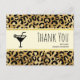 Thank you postcard with a stylish pattern featuring exotic leopard spots in black on a gold background. A black silhouette martini glass adds a nice party flair to the design. A cream coloured rectangle frame with a faux gold foil border layered over top with your personalized text inside.