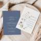 This wild forest floral back and front formal wedding invitation is perfect for a tropical wedding. This design features hand-painted watercolor white and blue wild forest flowers with green foliage.