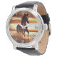 Watch in a portrait of a beautiful wild horse galloping through the surf, against a sunset sky