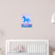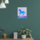 A poster with a pretty watercolor horse in blue and purple colors. Running wild and free. Set on a purple striped background with a vintage flair. A blue and pink watercolor border layered across the bottom.