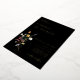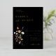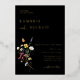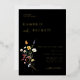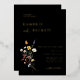 Wild Meadow Floral, Wedding Invitation. Colourful watercolor wildflower bouquet with gold foil typography on moody black colour backgrounds.