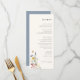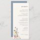 Elegant Watercolor Wildflower Floral Arrangement, wedding menu. Features, black typography on soft beige and coordinating solid dusty blue colour backing.