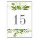 Garden chic table number cards feature top and bottom borders of vibrant painted watercolor greenery in shades of forest and fern green, framing your table number in gray. Design repeats on reverse side. Coordinates with our Wild Meadow wedding invitation suite.
