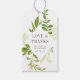 Attach these elegant botanical tags to your wedding favours to say thank you to guests in chic style. White tags feature a geometric border of lush greenery in watercolor shades of forest and fern green, framing "love and thanks" and your names and wedding date in grey. All text is editable for ultimate customization. Designed to match our Wild Meadow wedding collection.