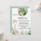 For baby's 1st birthday. A white background. a cute little baby giraffe and eucalyptus greenery, woodland ferns and balloons. Personalize and add the name and party details. Text: Wild One