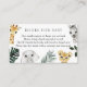 A book request insert card for baby shower. Featuring watercolor jungle animals, tropical leaves with poem: "ONE SMALL REQUEST, WE HOPE NOT TOO HARD