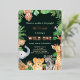 A fun and crazy jungle themed first Birthday invitation depicting a wild tropical jungle scene complete with a collection of cute wild creatures. This theme features wild animals and birds like elephant, cheetah, giraffe, zebra, monkey, toucan and ostrich framing the card in an amazing rain forest. The card features a unique custom 'Wild One' textured typography in real rose gold foil. Personalize the child's name also in rose gold foil. The background colour and text can be customized as per your requirement.