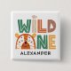 Wild One jungle themed first birthday button. Design features typography script Wild One in trendy lettering in safari colors and letter ''o'' in a shape of a tiger. Personalize with a name. Perfect for first birthday celebrations.