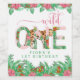 Preppy first birthday party supplies for your “wild one” features glittery pink and green hibiscus florals, patterned ONE, and a leopard stalking through the letters.