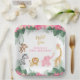 Super sweet safari birthday plates for your "wild one's" first birthday celebration! Cute monkey, striped zebra, jumping lion, sprinkling elephant and curious giraffe join the party :) Light and dark pink jungle flowers are paired against tropical leaves and ferns. Perfect for the baby girl's 1st birthday!