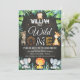 A safari themed 1st birthday party invitation to celebrate your little Wild One. Cute safari animals on a chalkboard background with animal print number ONE. The reverse has a giraffe print. Easy to personalise 1st birthday party invitation template.