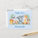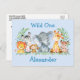 Watercolor Safari Jungle Animaux Wild One First Birthday Party Invitation Carte postale. Les bébés animaux comprennent l'éléphant, le singe, la girafe, le rhinocéros, le zèbre et le lion sur les feuilles de fougères. Aquarelle Botanique Verdure. Texte bleu.