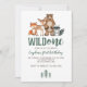 Wild One! Woodland Animal Birthday with bear, fox, deer, raccoon and trees with woodgrain back.