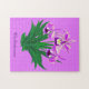 Puzzle in a digital illustration of a wild orchid plant, based on vintage botanical art, with flowers in shades of lavender to deep amethyst purple, and dark green leaves