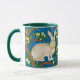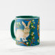 Coffee mug in an illustration of a wild rabbit, surrounded by flowering tree branches, against a denim blue background
