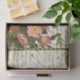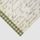 Collage featuring a beautiful pink wild rose illustration with a background of vintage handwritten French script and balanced with a bright green check border.
