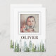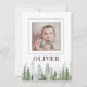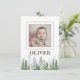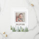 Rustic & vintage 2-sided birth announcement card featuring the name and photo of your new baby boy or girl using a white photo frame hand-painted pine trees in the background. The babies name, photo, birth record and parents name on the backside can be personalized to introduce your newborn to your friends and family.