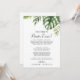 This wild tropical destination wedding welcome letter is perfect for a destination wedding welcome bag. The design features an exotic array of green watercolor banana palm tree leaves, ferns, foliage, botanical plants and greenery for a tropical summer feel. The front of the card features a welcome letter and optional itinerary.