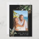This wedding photo save the date invitation card features watercolor monstera, palm tree leaves, banana leaves, exotic tropical leaves, and faux gold leaves with a faux gold rectangle frame. It's perfect for a tropical, beach, summer, or destination wedding.