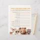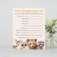 Baby shower word game featuring illustration of deer, bear, raccoon, and fox with sunglasses, pink hair, and mohawk.