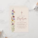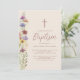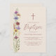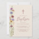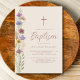 This rustic floral Baptism invitation is decorated with watercolor wildflowers, elegant script typography, and a cross on a soft cream background.