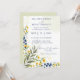This wedding invitation features an elegant and floral design with watercolor-style yellow and blue flowers along with green leaves decorating the sides.