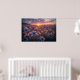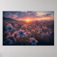 Magical sunset with wildflowers bathed in golden light. Sky in shades of pink and purple with mountains in the background. Ethereal and romantic image ideal for decor and creative projects. Bring serenity and natural beauty to your space with this enchanting landscape.