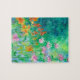 A pretty floral puzzle featuring a summer garden of wildflowers painted with watercolor in vibrant shades of pink and orange with a background of foliage in several shades of green.