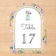 Elegant wedding table number featuring beautiful flowers and modern typography.