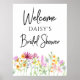 Wildflower Meadow personalized welcome poster - available printed or as a digital download. Pretty bohemian garden of wild flowers in pink yellow and orange with hand lettering. The pastel floral design is lettered with "Welcome to [your name's] Bridal Shower" in casual elegant calligraphy.