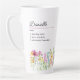 Wildflower latte mug with custom name definition. The personalization template is ready for you to add your name and your chosen definition, listing 3 personal attributes, characteristics or skills which could be true, funny, good or bad. The design features delicate watercolor meadow wild flowers in pink orange purple blue and yellow. It is lettered with casual modern script and classic typography. Feel free to change the font or background colour to suit (click "edit using design tool").