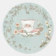 These envelope seals feature a sweet tea cup in the centre surrounded by a delicate wreath of wildflowers. The background is light robin's egg blue. Colours include rose red, sage green, pale blue, orange, pink and white.