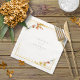 This elegant wedding collection uses a striking colour palette, including gold flake, burnt orange and sage green, to create matching stationery and party supplies for your special day. Watercolor florals and sparkling paint strokes provide eye-catching backgrounds. Handwritten script paired with a classic serif font lend a modern touch. The wedding paper napkin shown here with a floral border, provides a template to easily add your own names and wedding date. Search ID954 to see other pieces and colour choices for this set.