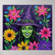 Green witch painting: vibrant, smiling green-faced witch in a jeweled purple hat surrounded by bold sunflowers and pink, purple blooms - whimsical floral magic.