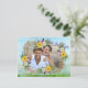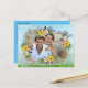 A dream garden is to be surrounded by cosmos and wildflowers on a sunny summer day with fluffy clouds in the blue sky to personalise an announcement card.