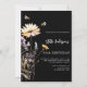 A black background. Decorated with bees and painted wildflowers in violet and pink. Personalize and add a name and party details. White text.