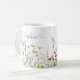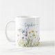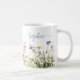 Custom script personal name Coffee Mug. A meadow full of watercolor wildflowers, butterflies and dragonfly. The name on both sides is in a peach script font with attached swirls/glyph on each side of the name for a feminine touch. You can keep them or delete. Try to write your name between the square icons and see before you decide.