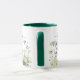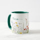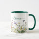 Custom script personal name Coffee Mug. A meadow full of watercolor wildflowers, butterflies and dragonfly. The name on both sides is in a peach script font with attached swirls/glyph on each side of the name for a feminine touch. You can keep them or delete. Try to write your name between the square icons and see before you decide.