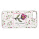 A phone case with your customized name and pretty pink flower inside a square frame with a pink border. The background is a pattern with hand drawn pink wildflowers with long green stems and leaves on a eggshell white coloured background. Pink circles and sprigs also decorate the design. Whimsical and pretty floral design.