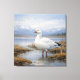 A snow goose stands peacefully in the shallows of a still northern marsh, its white plumage reflecting softly in the cool blue water. Golden tundra grasses frame the shoreline while distant snow-capped mountains rise beneath a calm, cloud-washed sky. The gentle layering of blues and grays creates a serene alpine atmosphere, emphasizing solitude and natural harmony. This artwork captures a tranquil moment in the rhythm of migratory life—graceful, contemplative, and timeless.