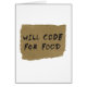 Coder in search of work...will code for food. Money is optional. Great for programmers, computer scientists and engineers in search of employment, food, or just a great laugh.